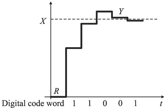 The successive approximation scheme belongs to fundamental and most successful methods of analog-to-digital conversion that has been implemented commercially for decades and is still used nowadays. Usually, the successive approximation is realized by oscillating or monotone algorithm []. Most ADCs for voltage input use the oscillating successive approximation (e.g., well-known ADC with charge redistribution []). Figure 6 shows an illustration how the oscillating successive approximation is realized using an analogy of weighting process of the unknown mass X by the use of a pan balance with a set of binary-scaled weights. Unknown mass X is placed in the pan S, and the weights are added always on the pan R. Before using a subsequent weight, it is necessary to check if the whole accumulated mass on the pan R is not larger than that on the pan S. If the total mass of the binary-scaled weights is larger than the input, the most recent weight is removed after each step. By the use of the oscillating scheme, the input X is successively approximated by its equivalent Y created in an oscillating way (Figure 7).