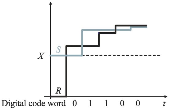 In the next steps, each weight is added to this pan (S or R) that carries actually lighter total mass, so the total mass of each pan can only increase, or remain unchanged. The subtraction operation is thus eliminated. The mass X is determined with accuracy to a quantization step by the difference between the total mass of weights added on the pan R and respectively on the pan S. The output bits are evaluated successively after each conversion step. If kth weight was placed on the pan R, and the total mass at this pan is greater than the total mass of the pan S, then a corresponding bit bk is evaluated to ‘zero’. Otherwise, bit bk is set to ‘one’. For bits bk corresponding to weights collected on the pan S, the opposite annotation is used. In the monotone successive approximation, the values of both S and R increase monotonically (Figure 9), which is convenient for direct analog-to-digital conversion of physical magnitudes that are inherently increasing (e.g., time). However, the monotone successive approximation is also applied to analog-to-digital conversion in the voltage domain [].