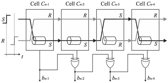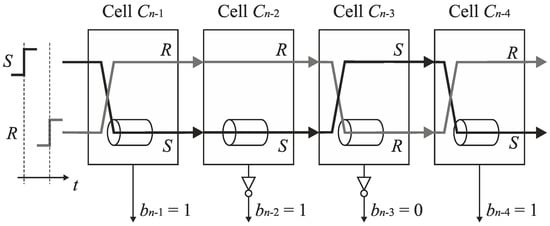 Further analysis of delay line swap shows that the output pair of switches SSOn−1, SROn−1, …, SSO1, SRO1 can be eliminated from the converter architecture presented in Figure 16 at the price of simple output decoding. Note that if the output pair of switches SSOk, SROk is removed from the cell Ck, then the edges S and R come to the inputs of the next cell Ck−1 in the opposite tracks in case if they have altered the tracks in the cell Ck. Although the RS latch Fk–1 in the cell Ck−1 recognizes which edge arrives earlier even if the edges arrive to the inputs of cell in opposite tracks, the output bit bk−1 is set then to an inverted state. The corresponding principle is presented in Figure 17. Assume that the edge S precedes the edge R at the input of the cell Cn−1. Then, the edge S is directed to the delay line located in the track R, and the bit bn-1 corresponding to MSB is evaluated to ‘one’. If the pair of output switches is removed, then the edges S and R are swapped, that is, they occur respectively in the track R and S at the input of cell Cn−2. Assume that the edge S (propagated in track R) follows the edge R (propagated in track S) at the input of the cell Cn−2. Subsequently, the output bit bn−2 is set to ‘zero’ instead of to ‘one’ because the edges (S and R) are propagated in the opposite tracks at the input of the cell Cn−2. Hence, in order to recover a correct state, the bit bn−2 has to be inverted. Next, let us assume that the edge R precedes the edge S at the input of cell Cn−3. Then, the edge R is directed to the delay line. The inversion of the state of the bit bn−3 is also needed because the edges (S and R) come to the inputs of the cell Cn−3 in altered tracks. Since the edge R has been guided to the delay line, an original track for the propagated edges are restored before they enter the inputs of cell Cn−4. Hence, the inversion is not needed for the bit bn−4.