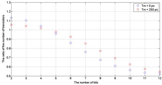 Table 1 and Figure 22 show the relationship of the ratio versus the SA-TDC resolution (n) for Tm = 0 and Tm = 250 ps. For , the number of transistors used to build the SA-TDC with single set of delay lines and output decoding is smaller than for the basic version with two sets of delay lines. For , the reduction of complexity is around 30% for Tm = 0 and around 20% for Tm = 250 ps, while for , respectively, is almost 50%.