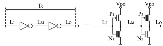 The time resolution of the TDC with time coding delay line presented in Figure 4 can be improved by the use of the Vernier principle in fully integrated TDCs (Figure 5) [,,,,]. In each conversion step, the edge S is delayed by ΔT0 in relation to the edge R, where ΔT0 = T0 − T’0 defines the converter resolution. The different values of delay units T0 and T’0 can be implemented by the design of two pairs of inverters with various W/L ratios for transistor sizes.