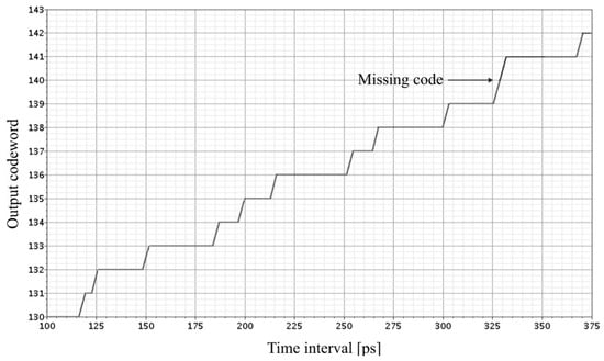 The impact of the use the symmetrized multiplexers on the 8-bit SA-TDC with Tm = 250 ps was assessed based on analysis of the simulation results for the differences in propagation delays contributed by multiplexers SSi and SRi with symmetrical control (Figure 36). In comparison to Figure 29, the inequalities of the propagation delays introduced by symmetrized multiplexers in the particular SA-TDC cells are lower than for the classical multiplexers used in the same conditions. With the symmetrized multiplexers, the transfer characteristics of the 8-bit SA-TDC for Tm = 250 ps does not include missing code words (Figure 37). The results of the analysis of INL and DNL for the code words corresponding to the half of full scale are respectively presented in Figure 38a,b. As follows from these plots, the INL and DNL errors are below 1/2 LSB. The parameters of the SA-TDC design with symmetrical control of multiplexers are summarized in Table 3. Furthermore, the comparison of the design presented in this paper is in Table 4 referred to previous works on SA-TDCs.