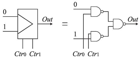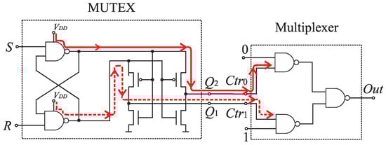 The classical multiplexer includes an inverter that introduces some design asymmetry (Figure 21a). To reduce the time of stabilization of the states on multiplexer outputs, the inverter has been removed from the multiplexer topology (Figure 33). Both channels (0 and 1) of the multiplexer are controlled directly from the MUTEX outputs, which are set to the opposite states. Therefore, the control of the channels is fully symmetrical (Figure 34). The use of symmetrical control of multiplexers in the SA-TDC requires to alter the connections between the MUTEX outputs and the multiplexers control inputs (Figure 35).