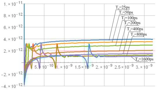 Differences of propagation delays of symmetrized multiplexers SSi and SRi vs. input time interval TIn with Tm = 250 ps.