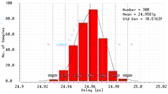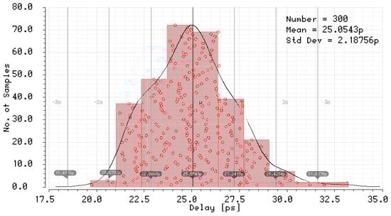 The simulation results of the mismatch and jitter time for the pair of inverters in the standard 180 nm CMOS process with a nominal delay of about 25 ps give and equal to 10.52 fs (Figure 39) and 2.19 ps (Figure 40), respectively. Both results for 8-bit SA-TDC correspond to fs, and ps, which is slightly lower than LSB.