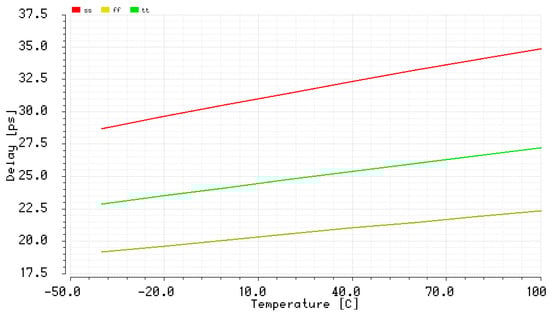In order to evaluate the impact of temperature and supply voltage variations on SA-TDC performance, the designed unit delay has been simulated for slow-slow (ss), typical-typical (tt) and fast-fast (ff) corners between −30 °C and 100 °C. At the typical operation conditions and room temperature, the unit delay is around 24.98 ps while it is around 31.76 ps for the worst case based on the ss corner (Figure 41).