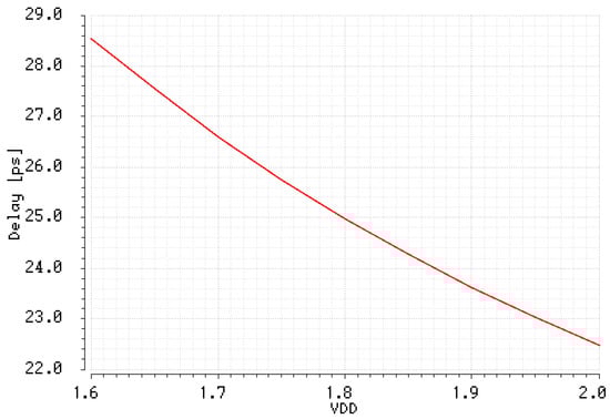 The designed single pair of inverters operates at the nominal voltage supply (VDD) of 1.8 V and the delay of the device depends on the variability of the VDD. The impact of voltage supply variations on the unit delay is presented in Figure 42. The simulation experiment shows that the propagation delay varies from 22.47 ps to 28.54 ps if VDD varies between 1.6 V and 2.0 V. At higher voltage supply the pair of inverters operates faster at the price of increase of the power consumption.
