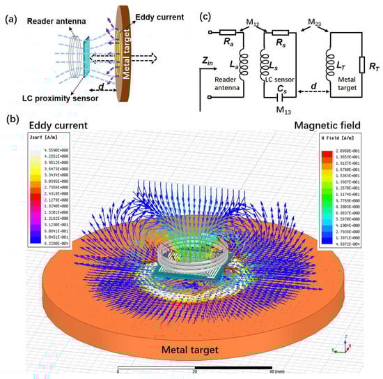 (a) Schematic diagram of the LC proximity sensor for metal target. (b) Electromagnetic simulation on the distribution of the eddy current and magnetic field. (c) Equivalent circuit of the proximity sensing system.