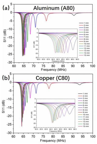 where ω is the angular frequency. It can be seen that Q value depends on the sensing distance d, since both L and R are functions of the sensing distance d, according to the Equations (11) and (12). From the perceptive of energy, the Q value is proportional to the ratio of the stored energy to the total power losses within the component [20]. The longer the distance is, the smaller the eddy current loss is, and therefore the higher the Q value is. This results in the magnitude of the resonance increasing with the sensing distance. In addition, it can be observed that the magnitude of the resonance from the copper target is lower than the aluminum target at the same tested distance. This can be better appreciated by comparing the insets of Figure 4a,b. The reason is that the lower resistivity of the copper target causes a higher eddy current [21], and the Q value for the copper target was lowered as a result.