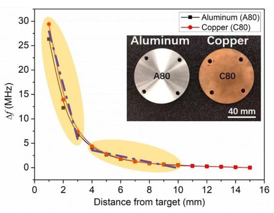 Since the frequency shift is more reliable than the Q value variation in the RF measurements, the difference (Δf) between the original resonance frequency of the sensor and the resonance at different test distances was extracted as the sensing signal for the distance measurement, as shown in Figure 5. Compared with the aluminum target, the copper target causes slightly larger Δf, and therefore has a higher sensitivity. Again, it can be attributed to the lower resistivity of the copper. There are two response sensitivity regions for both targets, as marked out in Figure 5. One is for the distance of 1–3 mm. By linear fitting, this region shows a high sensitivity of 11.2 MHz/mm, which is good for the accurate measurement in the micrometer scale. The other one is for the distance of 4–10 mm. By linear fitting, the sensitivity is about 0.6 MHz/mm, which is suitable for the long distance detection. It is worth mentioning that the sensing distance of the previously reported LTCC eddy current sensors is usually in millimeters ranges [12,13]. In Reference [13], they are able to measure up to 20 mm proximity distance of target, and the best sensitivity of presented inductive sensor was measured for distances up to 10 mm, repeatability measurement was verified for target distance from 4 to 7 mm. In this work, when the distance is larger than 10 mm, the signal resolution is near its limit. The nonlinear response of the LC proximity sensor over the whole sensing distance is due to the 1/d3 relationship of the inductor coils coupling coefficient k [22].