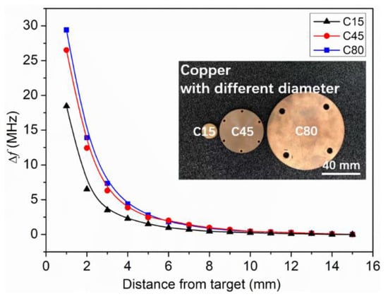 The surface area of the metal target is considered as another important influencing factor to the eddy current. Three copper plates with the same thickness but different diameters of 15, 45, and 80 mm (namely C15, C45 and C80, respectively) were used to investigate their effects on the sensor performance. Figure 6 shows the frequency shift of the LC proximity sensor in dependence of distance from the target for the three samples. It can be seen that the Δf increases with the increase of the surface area. This can be attributed to the increased influence on the sensor inductance from a larger target, which also means enhanced sensitivity of the sensor [22]. Compared with C45 and C80 targets, the Δf of the C15 target is the smallest. This is because the surface area of C15 is smaller than that of the LC proximity sensor, and truncates the eddy current, as the simulated results shown in Figure 7. In this case, the change of sensor inductance induced by the C15 target would be reduced. This implies that the surface area of the metal target should be bigger than that of the LC proximity sensor for the better practical measurements.