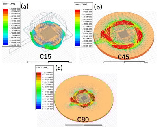 Simulated eddy current distribution for the target of (a) C15, (b) C45, and (c) C80.