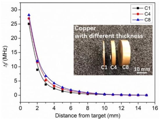 The effect of the thickness of the metal target on the LC proximity sensor is also investigated. Three copper plates with the same surface area but different thicknesses of 1, 4, and 8 mm (namely C1, C4, and C8) were tested. Figure 8 shows the frequency shift of the LC proximity sensor in dependence of distance from the targets of C1, C4 and C8. A decrease in Δf with the decreases of the thickness has been observed. This could be attributed to the influence of metal thickness on the eddy current. The thinner the thickness is, the smaller the eddy current is, and therefore the lower the sensitivity [23].