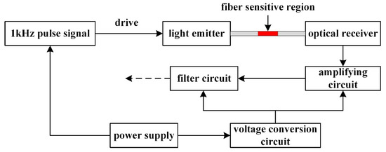The sensor conditioning circuit mainly includes functional module circuits such as amplification, filter, voltage conversion and so on, which can recognize the weak signal change of the sensor output. As shown in Figure 5, when the pulse signal drives the light emitter and the red light emitted by the light emitter is transmitted through the optical fiber, the bending information of the sensitive region of the fiber is converted into the voltage signal which is the output of the light receiver. Then the signal is amplified and filtered, finally being obtained by the microcontroller.