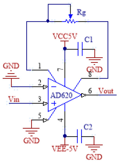 The input signal of the sensor is the bending information of the sensitive region of the fiber, and the output signal is a weak voltage signal. Generally, it is within 50 mV, and with the positive and negative bending of the sensitive region of the fiber, the dynamic range of the signal is wide, which, in the meantime, is easily affected by the working environment. Therefore, the input at the next stage must have large common-mode interference. In order to reduce the interference, the instrumentation amplifier AD620 is selected in the amplifier circuit for amplification. Compared to general-purpose amplifiers, AD620 has the advantages of the small operating current, high common-mode rejection ratio, low offset and drift, low noise and high closed-loop gain stability [18,19].