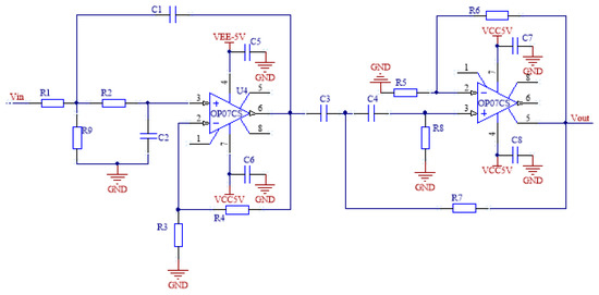 According to relevant knowledge of the analog circuit [22], the band-pass filter circuit can generally be formed by a low pass filter circuit and a high pass filter circuit connected in series. In order to reduce the output voltage at a faster rate outside the passband, improving the ability of the band-pass filter to remove noise, the second-order low-pass and second-order high-pass filter circuits are connected in series to form a fourth-order band-pass filter. As shown in Figure 7, the amplitude-frequency characteristic of the circuit is narrow, and the gain of the passband is 0 dB. At the frequency of 650 Hz or 1350 Hz, the amplitude attenuation is about 3 dB.