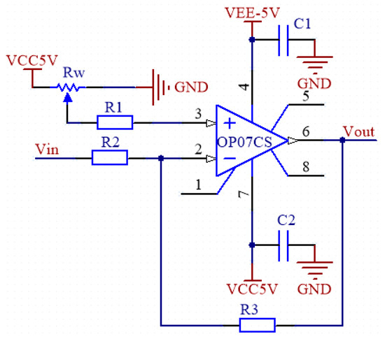 The micro signal output by the sensor has been amplified and filtered, and the final output signal is supposed to be a sine wave voltage signal [23]. If the sine wave signal is directly connected to the IO pin of the A/D input of the microcontroller, only the positive voltage in the range of 0–3.3 V could be measured, while the negative voltage would directly return to 0. Therefore, it is also necessary to carry out bias processing on the signal to raise the whole sine wave signal above the 0 level and ensure that the maximum amplitude of the signal is below 3.3 V. According to the principle of voltage divider, the designed circuit is shown in Figure 8. By adjusting the resistance of the slide rheostat to change the value of , the sinusoidal signal can be moved up and down as a whole, and the sinusoidal signal waveform can be controlled between 0–3.3 V.