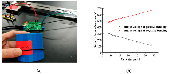 As shown in Figure 9a, the sensitive region of the fiber is sequentially pressed against the surface of a series of cylinders with a radius of 10 mm, 20 mm, …, 120 mm for positive and negative bending. According to the output voltage of the sensor, the relationship curve between the output voltage of the sensor and the bending curvature can be obtained through linear fitting within a certain range, as shown in Figure 9b: