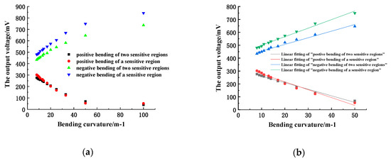 (a) relationship between output voltage of two sensitive regions and bending curvature; (b) linear fitting of two sensitive regions.