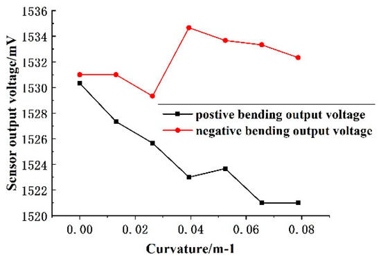 It can be seen from the above graph that the two fitting lines when the fiber is positively and negatively bent are basically symmetrical about the voltage value of 400 mV (that is, the output voltage value of the sensor when the fiber sensitive region is not bent). The measurement range of the fiber curvature sensor is defined as 8.33 to 33.3 m−1. Within this range, the output voltage of the sensor is linearly related to the curvature.