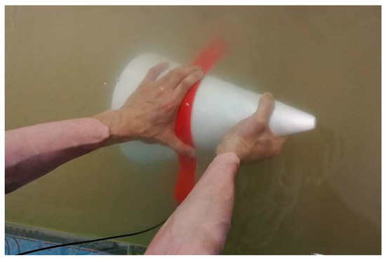 As shown in Figure 13, the optical fiber interlayer, is attached to the surface of a core with a bottom diameter of 30 cm and a height of 35 cm (taper of 0.86) underwater, moving slowly upward from the side of the cone near the bottom (the sensitive regions of the fiber are always kept close to the side of the cone in the process of moving), and the single-chip microcomputer is used to collect the real-time output voltage of the sensor.