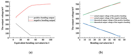 (a) relationship between output voltage and equivalent bending curvature; (b) relationship between the actual measured and theoretical output voltage and the bending curvature.
