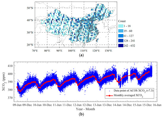 Number of available retrievals and temporal changes of collected XCO2 data: (a) the number of XCO2 data points within 1° × 1° grid for 6 years from 2010 to 2015; (b) the temporal variation of XCO2 and the monthly averages.