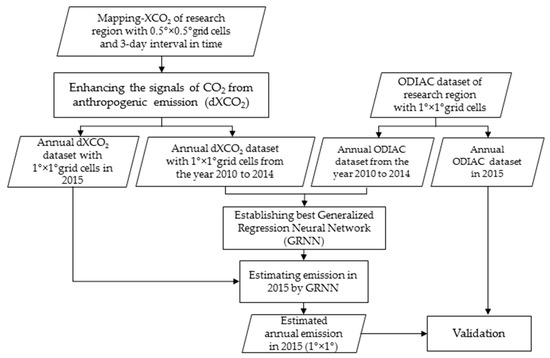 Firstly, we enhance the signals of CO2 from anthropogenic emission in XCO2 which is described in Section 2.3.1. Secondly, we apply the training datasets of XCO2 and ODIAC in 2010–2014 to GRNN to get the estimating model of anthropogenic emission which is described in Section 2.3.2 in detail. Thirdly, anthropogenic emissions are estimated by GRNN model using XCO2 in 2015, and validated by comparing with ODIAC data in 2015.