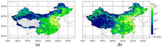 The anthropogenic CO2 emissions in 2015 in China: (a) CO2 emission estimated using GRNN based on the annual dXCO2 in 2015 from GOSAT observations. The Tibet area shown as blank is filtered due to their high uncertainty XCO2 retrievals; (b) the CO2 emission from ODIAC in 2015.