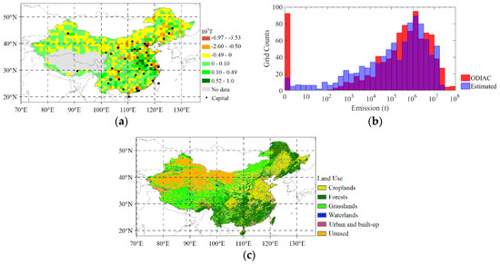 (a) The difference between the estimated CO2 emission using mapping-XCO2 in 2015 and ODIAC emission in 2015; (b) Histogram comparison of the estimated and the ODIAC CO2 emission (in unit of Ton/year) in 2015; (c) Land use of China in 2010.