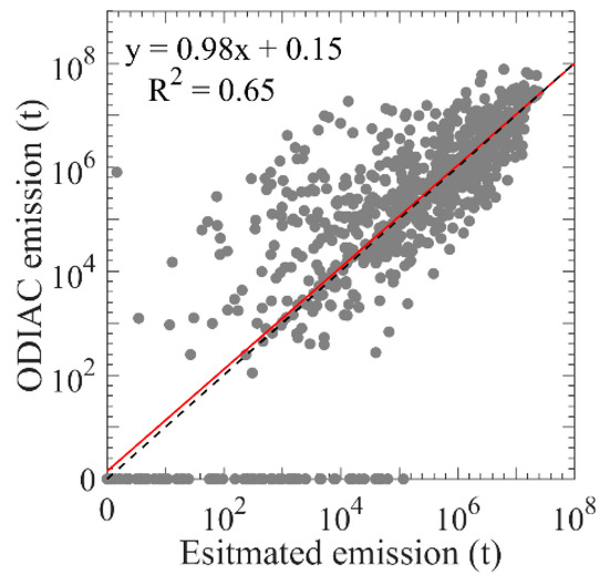 Scatterplot between estimated CO2 emission using mapped-XCO2 data and the actual ODIAC emission in 2015, in which red line is the regression line between estimated emission and ODIAC emission, and black dotted line is the 1:1 line.