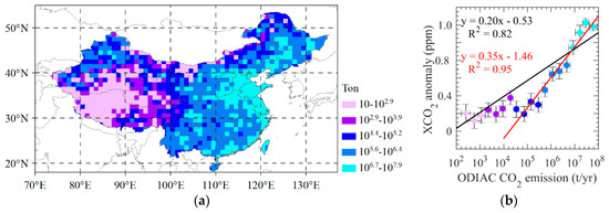 (a) Segment of ODIAC emissions, where the data are binned by every 0.3 t/yr of lgE using mean emission calculated from annual emission during 2010–2015; (b) correlation between mean ODIAC CO2 emissions and mean dXCO2 calculated from annual dXCO2 during 2010–2015 for each segment, where red line is the regression line between dXCO2 and ODIAC CO2 emissions with emission lager than 104 t/yr.