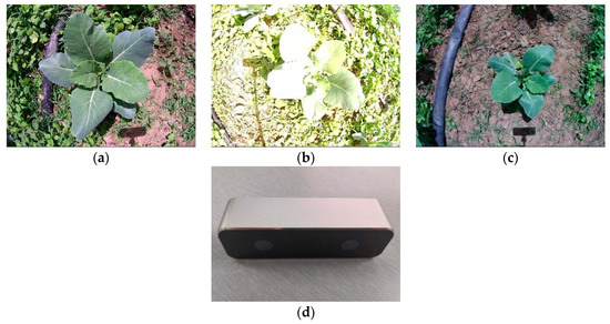 The broccoli seedlings were bred on March 25, 2018 and transplanted on April 28, 2018. The broccoli seedling images were acquired from 10:00–12:00 pm, on May 23, 2018, ate the Beijing International Urban Agricultural Science and Technology Park (116°47′57″E, 39°52′7″N). The image acquisition device is an integrated binocular camera (VR (Virtual Reality) Camera, BOBOVR, Shenzhen, China) with a resolution of 1280×480, the frame frequency of 30 fps, CMOS, Fov 120°, the baseline length of 60 mm, the working distance of 500–2000 mm, USB 2.0, 600 RMB. The working platform is OMEN by HP Desktop PC 880-p1xx, 8GB RAM, Inter Core i7-8700 @ 3.20 GHz, Windows 10, 64 bit system (DirectX 12). The software used was MATLAB R2016b (Math Works Corporation, Nattick, MA, USA), and Adobe Photoshop CS6 (64 bit, Adobe, San Jose, CA, USA). A checkerboard calibration board with a square size of 30 mm × 30 mm was used for camera calibration. The broccoli seedling images and binocular camera are shown in Figure 1.