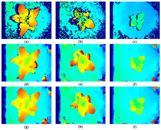 As shown in Figure 4d–i, disparity maps obtained by the SSD algorithm [57] are superior to disparity maps obtained by SAD algorithm [57], but their quality are both inferior to disparity maps obtained by SGM algorithm, because of the un-smoothness, ambiguous boundaries between broccoli seedling and background, and large noise areas of background shown as the orange, red and yellow areas. The matching window size, maximum disparity and matching time of SAD, SSD, SGM are shown in Table 1.