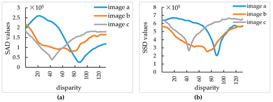 (a) represents SAD values when the stereo matching window size is 55×55 pixel, maximum disparity is 130 pixel at point (400,400) of images in Figure 3d–f; (b) represents SAD values when the stereo matching window size is 55×55 pixel, maximum disparity is 130 pixel at point (400,400) of images in Figure 3d–f.