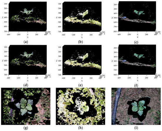 As shown in Figure 6a–c, broccoli seedlings, weeds, pipelines, and soil were reconstructed successfully, and the height advantage of broccoli seedling is highlighted. But because of the matching error of SGM algorithm, there are still some outliers and invalid points in the original 3D point cloud.