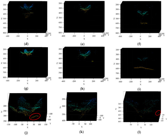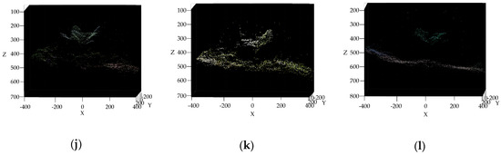 (a–c) represent broccoli seedling clustering results by the GMM algorithm, (d–f) represent broccoli seedling clustering results by the K-means algorithm, (g–i) represent broccoli seedling clustering results by the Fuzzy c-means algorithm, (j–l) represent outlier filtering results of Figure 7a–c by the KNN algorithm.