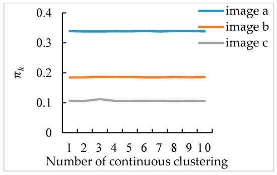 To further illustrate the stability of the GMM algorithm, 10 times clustering for each broccoli seedling were taken and the of the broccoli seedling component was obtained. A line diagram was drawn as shown in Figure 8. The standard deviation of the three sets of is 5.54 × 10−4, 6.24 × 10−4, 1.85 × 10−3 respectively, which shows the values of each set of have a small change. The three lines in Figure 8 are close to horizontal line, which shows the GMM algorithm has good stability.