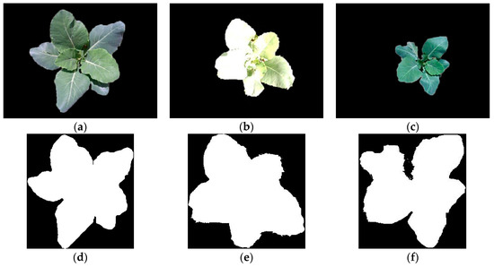 As shown in Figure 4a–c, disparity maps can be obtained by the SGM algorithms. Figure 4a,c shows that the broccoli seedling regions were matched smoothly, and the marginal parts were also preserved completely. In Figure 4b, due to the camera overexposure, there are some mismatched areas in the upper and left blades of the broccoli seedlings, but the boundary between broccoli seedlings and background was matched clearly, and for this reason, these mismatched areas did not affect the next reconstruction and identification of broccoli seedling.