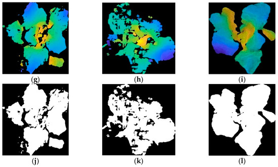 (a–c) Manually segmented images. (d–f) show cropped binary images of (a–c), (g–i) show top views of broccoli seeding points obtained by the GMM algorithm, (j–l) are binary images of (g–i).