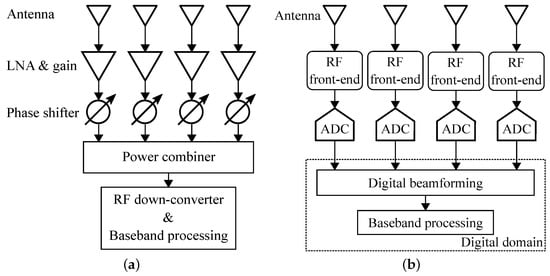 Block diagram of (a) RF beamforming architecture; (b) digital beamforming architecture.