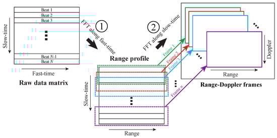The basic signal processing for an FMCW radar includes two steps: (1) process “fast-time” to obtain range profile; (2) process “slow-time” to obtain moving properties of targets. Figure 3 shows the procedure of the two-step radar signal processing []. The raw data matrix consists of a series of time domain beat signals. The range profile can be obtained by applying Fourier transform along the “fast-time”. With the range profile, a series of range-Doppler frames can be calculated by windowing the range profile and performing Fourier transform along the “slow-time”. Range-Doppler frames reveals moving properties, as well as micro-Doppler properties of targets.