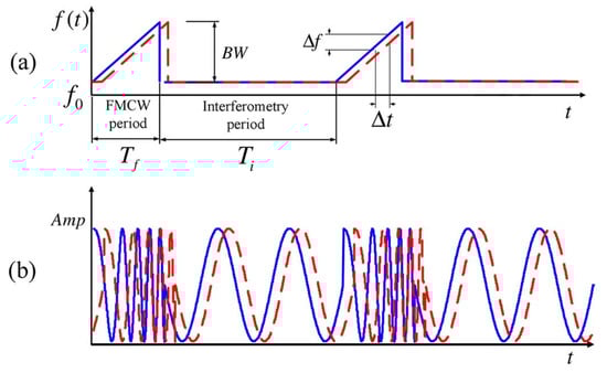 The principle of FMCW radar is illustrated in Figure 1. FMCW radar transmits a linear modulated RF signal, which is also referred as the chirp signal, to the target []. The reflected signal has a time delay , which is caused by the round-trip travelling distance of the electromagnetic wave between radar and the target: