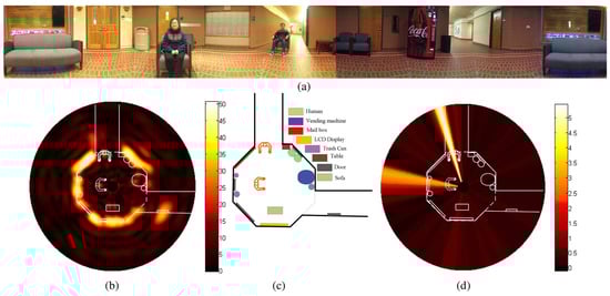 Experimental setup and results of the proposed hybrid radar system. (a) panorama photo of the environment; (b) 2D localization map with the FMCW mode; (c) room layout; (d) motion information with the Doppler mode [].