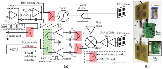 A portable hybrid radar was proposed and built in []. This 5.8 GHz hybrid radar was built with off-the-shelf components. Figure 6a shows the simplified schematic of the built 5.8 GHz portable hybrid radar prototype. In the FMCW mode, to minimize the size and cost of the system, a simple sawtooth generator circuit based on operational amplifiers is used to generate ramp voltage. The generated sawtooth range voltage is used to control a free-running voltage-controlled oscillator (VCO) to generate chirp signals []. The sawtooth generator circuit also simultaneously synthesizes the reference pulse sequence (RPS), which is synchronized to the sawtooth voltages. For the baseband, the audio card of a laptop is used to sample the analog baseband signal. On the other hand, in the Doppler mode, a low-intermediate-frequency (low-IF) modulation scheme was also used up-convert the baseband signal to an IF with simple analog switches. This low-IF modulation method makes it possible to sample the extreme low frequency vital signs with the audio card. A micro-controller is used to switch this radar prototype between the FMCW mode and the Doppler mode. The photo of the prototype is shown in Figure 6b.
