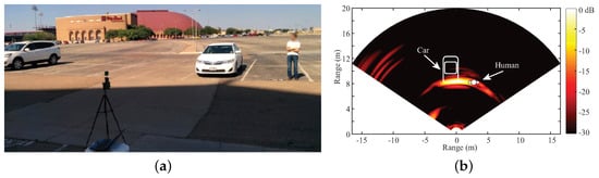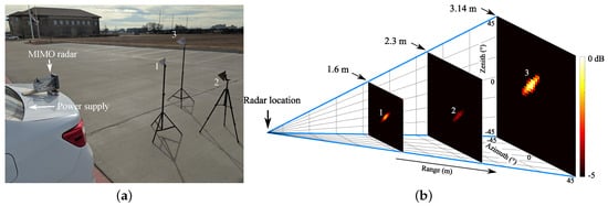 (a) photo of the experiment setup; (b) 3D localization mapping of the three targets with the portable MIMO radar prototype [].