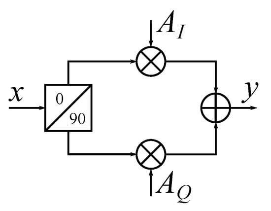 Among these various approaches, the vector modulator technique, which is based on the concept of vector sum, is one of these optimal solutions for RF beamforming FMCW radar systems at higher frequencies [,,,]. The basic concept of a vector modulator is shown in Figure 8. Assume a single tone input signal , where  is the carrier frequency and t is time. In the vector modulator, the input signal is divided into an in-phase (I) signal and a quadrature (Q) signal by a quadrature power divider. The amplitudes of I and Q signals are controlled separately by a pair of variable gain amplifiers (VGA) or attenuators. Then, these two signals are combined together. The output signal y of the vector modulator can be expressed as: