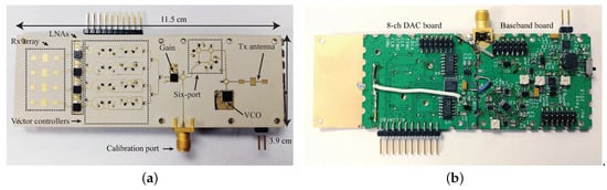Photographs of the 24 GHz RF beamforming radar prototype. (a) top view; (b) bottom view [].