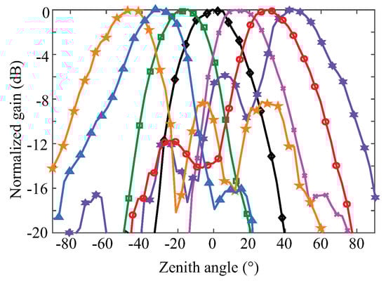 Measured radiation patterns of the array steering to , , , , , , and  at 23.75 GHz [].
