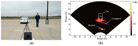 (a) experimental environment of short-range localization with the RF beamforming radar prototypes; (b) measured result of the 2D localization experiment [].